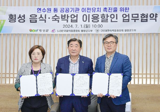 (아름다운교육신문) 횡성군과 (사)한국외식업중앙회 횡성군지부, (사)대한숙박업중앙회 횡성군지부는 7월 1일 횡성군청에서 ‘연수원 등 공공기관 이전유치 촉진을 위한 음식·숙박업 이용할인 업무협약’을 체결했다.