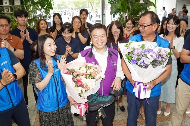 직원들은 남은 임기동안 동대문구를 위해 더 열심히 뛰어달라는 의미에서 이 구청장에게 등산화를 전달했다.