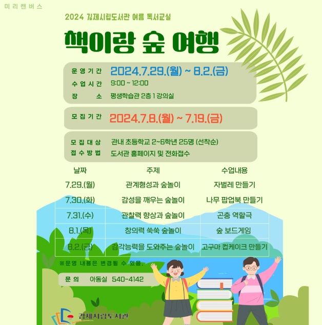 (아름다운교육신문) 김제시립도서관은 오는 29일부터 8월 2일까지 5일간 지역 초등학생 2 부터 6학년 25명을 대상으로 여름 독서교실 프로그램인 '책이랑 숲 여행’을 운영한다고 밝혔다.