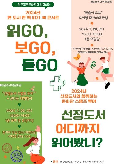 (아름다운교육신문) 원주교육문화관은 7월 20일 원주교육문화관 대강당에서 지역 주민을 대상으로 원주 한 도시 한 책 읽기 북 콘서트 ‘읽고(GO), 보고(GO), 듣고(GO)’를 개최한다.