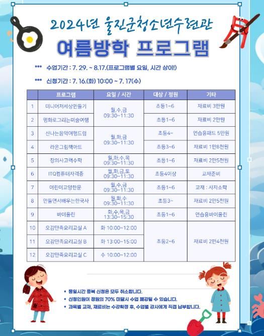 (아름다운교육신문) 울진군은 울진군청소년수련관에서 오는 16일 오전 10시부터 17일까지 2일간 여름방학 특기·적성 프로그램 수강생을 모집한다.