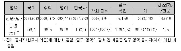 영역별 응시자 수는 국어 영역 390,603명, 수학 영역 386,972명, 영어 영역 392,110명, 한국사 영역 392,783명, 사회·과학탐구 영역 385,075명, 직업탐구 영역 5,158명, 제2외국어/한문 영역 6,046명이었다.