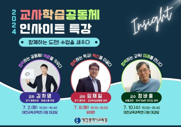 대전광역시교육청 윤정병 유초등교육과장은 “교사학습공동체 인사이트 특강을 통해 효과적인 수업 전략 공유 및 피드백, 새로운 수업 방법의 도입, 교사 간의 어려움을 공유하고 해결책을 모색하는 과정 등 실질적인 변화를 이끌어낼 것으로 기대한다.”라며 “학교 교육이 학생들의 배움과 성장을 지원할 수 있도록 교실 수업 혁신 지원을 아끼지 않겠다.”라고 말했다.
