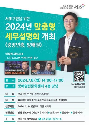 (아름다운교육신문) 서울 서초구가 복잡한 세제정책으로 인한 구민들의 세금고민 해결을 위해 오는 8일 방배열린문화센터에서 ‘2024년 맞춤형 세무설명회’를 개최한다.