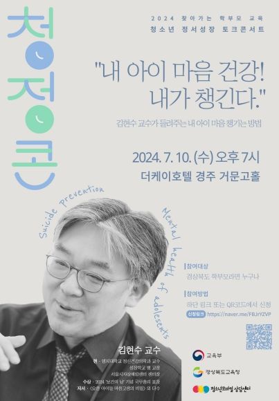 (아름다운교육신문) 경북교육청은 오는 10일 경주시에 있는 더케이호텔 경주 거문고홀에서 명지병원 정신건강의학과 김현수 교수와 함께하는 ‘청소년 정서 성장 토크 콘서트’를 개최한다고 밝혔다.