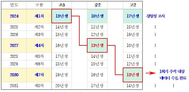 대전교육종단연구는 데이터 기반의 대전교육정책 수립을 위해 학교 교육활동 현황을 파악하고 학생의 성장과 발달에 영향을 미치는 요인을 체계적이고 지속적으로 조사‧분석하는 연구이다. 대전교육종단연구는 매년 초5, 중2, 고2 학생을 전수 조사하는 반복적 횡단조사로, 1회기 추적 대상 데이터 수집은 2024년 초5 학생이 2027년 중2, 2030년 고2 때 참여하면 완료되며, 3회 모두 참여한 학생을 추출·분석하여 패널조사(추적조사) 효과까지 기대할 수 있다.