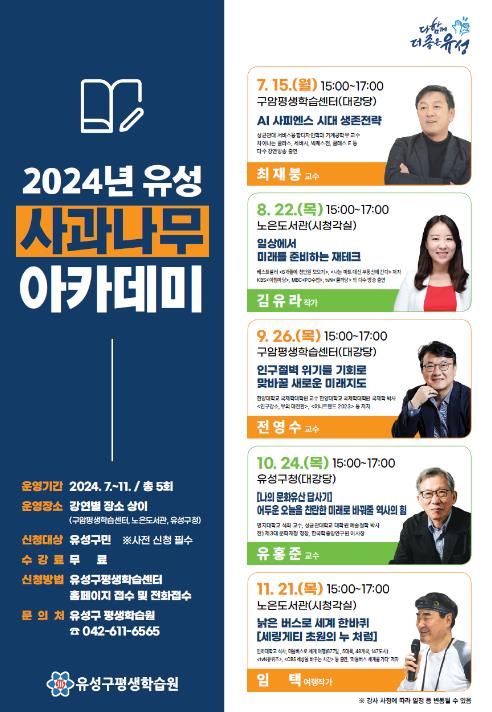 (아름다운교육신문) 대전 유성구는 7월 15일부터 11월 21일까지 평생학습센터, 노은도서관, 유성구청 등 3개소에서 다양한 분야의 전문가와 명사를 초청해 주민의 인문학적 소양과 지적 욕구를 충족시키기 위한 공개강좌'2024 유성 사과나무 아카데미'를 개강한다.
