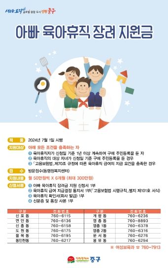김정헌 중구청장은 “아빠 육아휴직 장려금 지원을 통해 임신·출산·양육 시기에 아빠들이 직장과 가정을 조화롭게 양립할 수 있을 것”이라며 “여성에게 편중된 육아 부담을 경감하고, 아빠들의 육아 참여 기회 확대로 가족 친화적 사회 환경 조성에 이바지할 것으로 기대된다"라고 말했다.