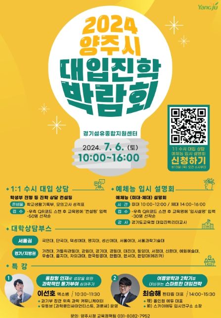 이번 ‘2024 양주시 대입진학박람회’는 학생, 학부모에 대한 맞춤형 대입진학정보를 제공하기 위해 기획됐다. 경기도교육청 소속 진학리더교사들이 일대일 진학 컨설팅을 진행하며 미술·체육 계열 입시설명회를 진행하고 최신 입시 동향, 여름방학 학력 향상을 위한 방법 등 특강과 동시에 서울 경기권 주요 25개 대학이 홍보 부스를 운영한다.