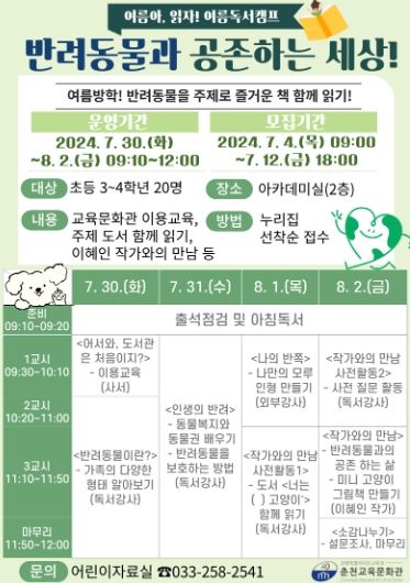 (아름다운교육신문) 춘천교육문화관은 여름 방학을 맞아 오는 7월 30일(화)부터 8월 2일(금)까지 4일간 관내 초등학생 3·4학년 20명을 대상으로 여름 독서캠프를 운영한다.