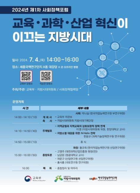 (아름다운교육신문) 교육부와 지방시대위원회(위원장 우동기)는 사회정책협력망 국책연구기관들과 함께 ‘교육‧과학‧산업 혁신이 이끄는 지방시대’를 주제로 7월 4일, 세종국책연구단지에서 제1차 사회 정책 공개토론회(포럼)를 개최한다.