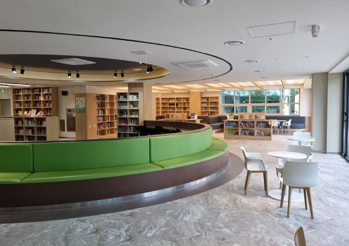 학생 이용 편의성을 고려해 1층 남측에 배치된 도서관은 폴딩도어를 적용해 외부 데크와 오솔길과 연결되도록 했으며, 스터디카페는 검색 공간과 학습 공간을 분리하고, 식당은 커튼월 창문을 적용해 개방감을 높였다.