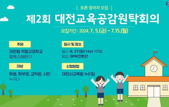 (아름다운교육신문) 대전광역시교육청은 8월 27일 오후 2시, BMK컨벤션에서‘대전형 적정규모학교 함께 이해하기’라는 주제로 개최하는 '2024년 제2회 대전교육공감원탁회의'에 참여할 토론참여자를 모집한다고 밝혔다.