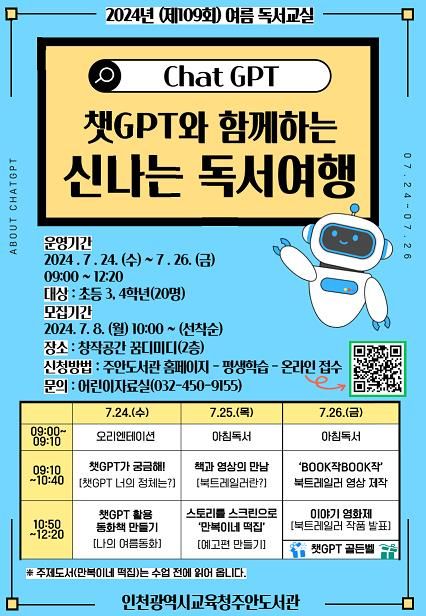 (아름다운교육신문) 인천광역시교육청주안도서관은 여름방학을 맞아 관내 초등학교 3학년부터 4학년 학생 20명을 대상으로 24일부터 26일까지 ‘챗GPT와 함께하는 신나는 독서 여행’ 여름 독서교실을 운영한다.