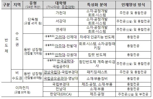 반도체 특성화대학에는 개별 대학이 인재양성 계획을 수립하는 ‘단독형’에 △가천대△서강대△연세대(가나다 순) 3개교를 선정했으며, 대학 간 보유 역량을 공동으로 활용하기 위해 복수학위 등 협업을 토대로 인재양성 계획을 수립하는 ‘동반성장형’에 △고려대-인제대△아주대-한밭대△인하대-강원대△한국공학대-국립공주대(가나다 순)를 선정했다. 또한, 지역 여건 등을 고려해 강화된 재정 지원을 받는 ‘비수도권 동반성장형’에 △경상국립대-국립부경대△금오공과대-영남대(가나다 순)를 선정했다.