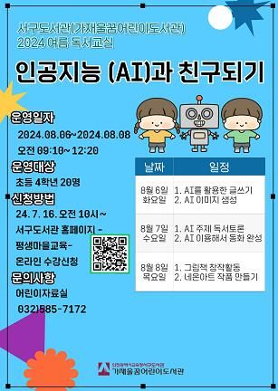 (아름다운교육신문) 인천광역시교육청서구도서관은 여름방학을 맞아 초등학교 4학년 어린이 20명을 대상으로 ‘인공지능(AI)과 친구되기’를 주제로 여름 독서교실을 운영한다.