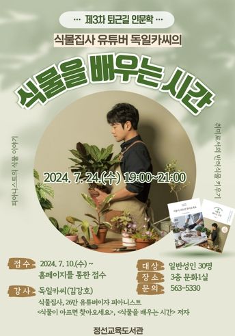 이번 강연은 ‘식물을 배우는 시간’을 주제로 피아니스트이자 식물 집사 유튜버이며 도서'식물이 아프면 찾아오세요'의 저자인 김강호(독일카씨) 강사가 초보자들이 식물을 키울 때 알아두면 좋은 것들과 취미로서의 반려 식물에 대해 알려준다.