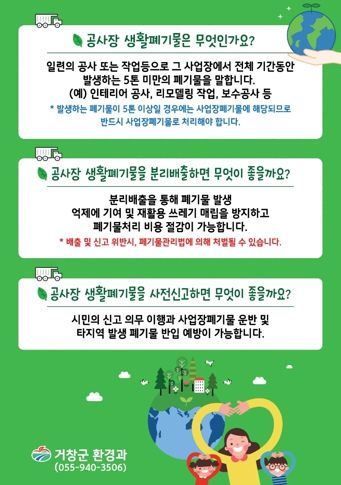 (아름다운교육신문) 거창군은 7월부터 5톤 미만의 공사장 생활폐기물을 배출할 때 배출자의 성명, 배출품목, 배출량 등을 군청에 신고해야 하는 ‘공사장 생활폐기물 사전 신고제’를 시범운영 한다.