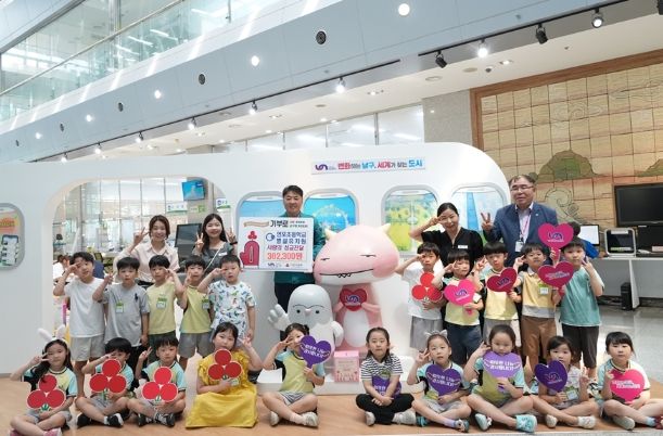 연포초등학교 병설유치원 슬기반 어린이들은“저희가 모은 돈을 우리 동네에 기부합니다. 어려운 이웃을 위해 사용해 주세요.”라고 하며 고사리 같은 손으로 청장님께 후원금을 전달했다.