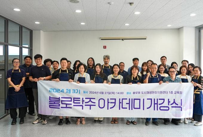 (아름다운교육신문) 대구 동구청은 지난 6월 27일 불로동 도시재생뉴딜사업 창업·기술전수교육의 일환으로 추진하는 ‘2024 제3기 불로탁주아카데미(기초과정)’ 개강식을 가졌다.