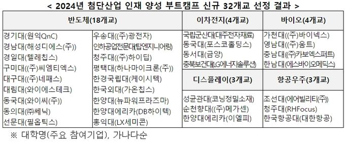 2024년에는 보다 많은 대학생들에게 현장감 있는 교육을 제공하기 위해 이차전지, 디스플레이, 바이오, 항공·우주까지 분야를 넓히고, 지원 대학도 대폭 확대했다. 올해 본 사업에 58개 대학이 사업계획서를 제출했으며, 6월 18일(화)부터 6월 26일(수)까지 진행된 평가를 통해 32개교를 선정했다.