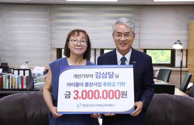 (아름다운교육신문) 경상남도미래교육재단은 8일 경북 포항시에 거주하는 경남 출신의 김삼달(여, 61세) 씨가 ‘아이좋아 통장사업’에 300만 원을 기부했다고 밝혔다.