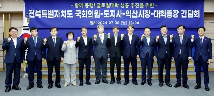 전북자치도는 8일 도청 종합상황실에서 김관영 도지사, 도내 국회의원 9명, 정헌율 익산시장, 박성태 원광대 총장, 백준흠 원광보건대 총장이 참석한 가운데 ‘글로컬대학 성공 추진 간담회’를 가졌다.