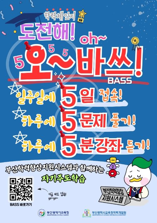 ‘도전해! 오~바쓰!(5.5.5.실천) 캠페인’은 학생들이 부산학력향상지원시스템(BASS)을 통해 ▲‘일주일에 5일 접속!’, ▲‘하루에 5문제 풀기!’, ▲‘하루에 5분 강좌 듣기!’를 실천해 생활 속에서 부담 없이 스스로 학습을 이어갈 수 있게 하는 것이다.