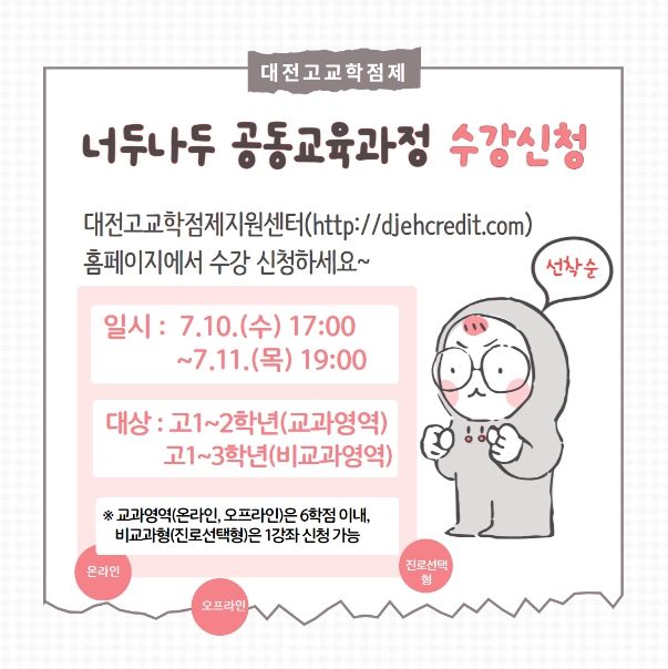 (아름다운교육신문) 대전광역시교육청은 7월 10일 17:00부터 관내 고등학생을 대상으로 학생의 과목 선택권 보장과 진로 맞춤형 교육 지원을 위한‘너두나두 공동교육과정 2학기 신청’을 받는다고 밝혔다.