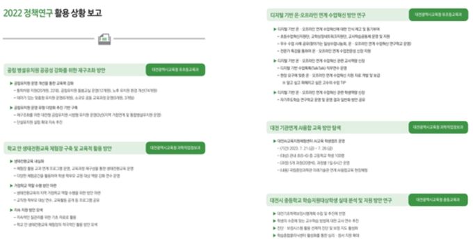 교육활동 침해 피해교원은 수치심, 외로움, 무능감, 좌절감 등의 부정적 감정을 겪어 교육력 하락으로 이어진다는 연구결과에 따라 에듀힐링센터(교육활동보호센터) 피해교원 상담을 강화했고, 교육활동 보호 정책과 제도의 정비가 필요하다는 연구 결론에 따라 ‘2023년 대전광역시교육청 교육활동 보호 종합대책 추진 계획’을 변경하여 10대 강화 방안을 마련하는 등 정책연구 결과가 적극적으로 정책에 반영되어 실행되는 것으로 확인됐다.