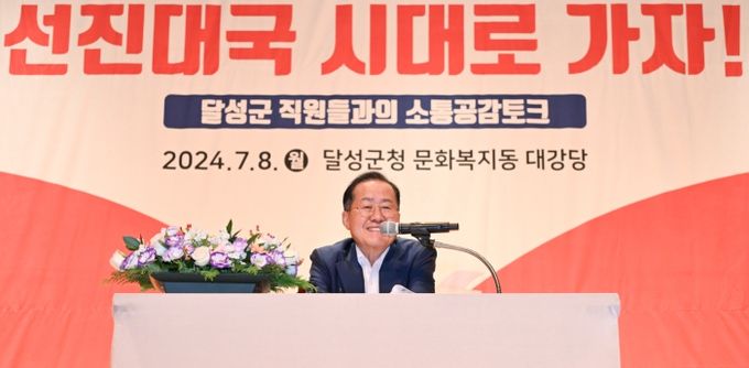 (아름다운교육신문) 대구광역시는 7월 8일 오후 3시 달성군청 문화복지동 대강당에서 ‘선진대국 시대로 가자!’라는 주제로 홍준표 대구광역시장과 달성군 직원들과의 소통·공감 시간을 가졌다.