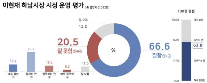 ▶ 하남시장 시정 운영 “잘한다” 66.6%···“잘못한다” 20.5%와 비교해 3.3배가량 높아