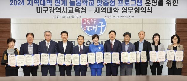 (아름다운교육신문) 대구시교육청은 7월 8일 16:30, 시교육청 여민실(동관 3층)에서 지역대학 10곳과 늘봄학교 맞춤형 프로그램 운영을 위한 업무협약을 체결했다.