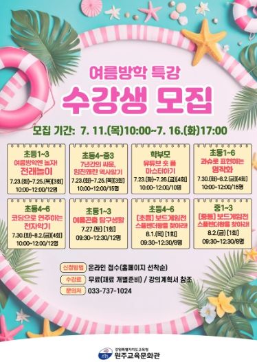 (아름다운교육신문) 원주교육문화관은 7월 11일부터 16일까지, 관내 초·중학생 및 학부모 대상으로 여름방학 특강 수강생을 모집한다.