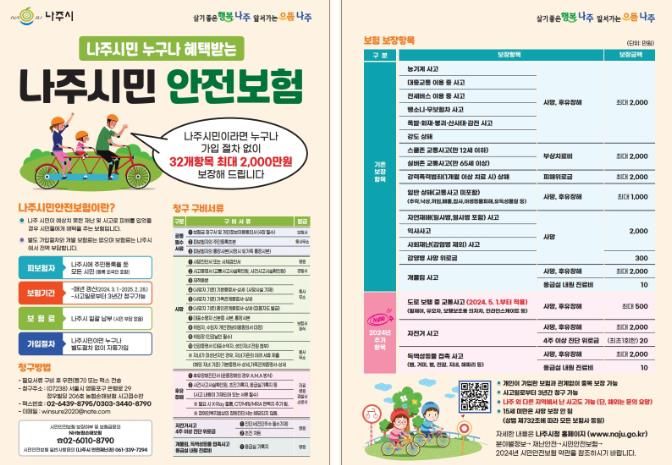 윤병태 나주시장은 “예기치 못하지만 일상에서 빈번히 발생하는 재난·사고에 대비해 시민안전보함 보장 범위를 매년 확대하고 있다”며 “적극적인 홍보와 더불어 재난 대비, 사고 예방을 위한 사회 안전망 구축에도 최선을 다하겠다”고 전했다.