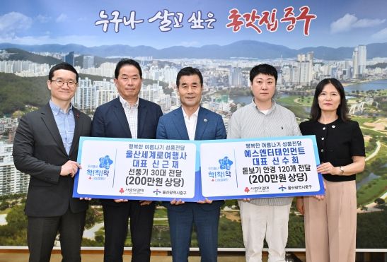 이번 전달식에는 김영길 중구청장과 신수희 예스엔터테인먼트 대표, 신근재 울산세계로여행사 대표, 차정하 울산사회복지공동모금회 모금사업팀장 등이 참석했다.