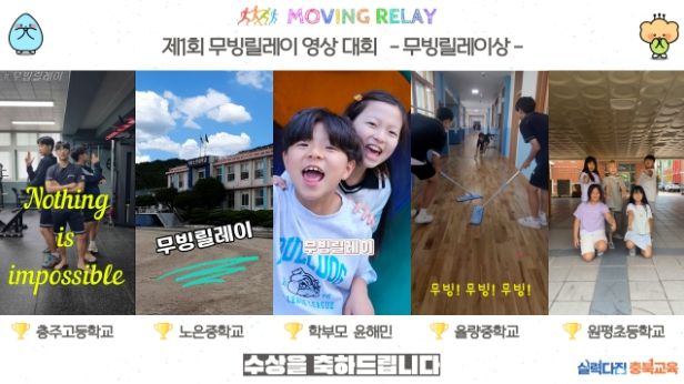 무빙릴레이상은 ▲충주고등학교(김지원 학생 외 2명) ▲율량중학교(인수진 교사 외 학생 12명) ▲원평초등학교(변준철 교사 외 학생 5명) ▲노은중학교(유애리 교사 외 학생 17명) ▲학부모 윤해민(외 자녀 2명) 등 총 5개 팀이 수상했다.