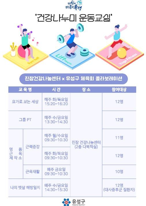 (아름다운교육신문) 대전 유성구 보건소는 진잠건강나눔센터에서 운영 중인 인기 프로그램 ‘건강나누미 운동교실’을 7월부터 유성구체육회와 협업하여 확대 편성한다.