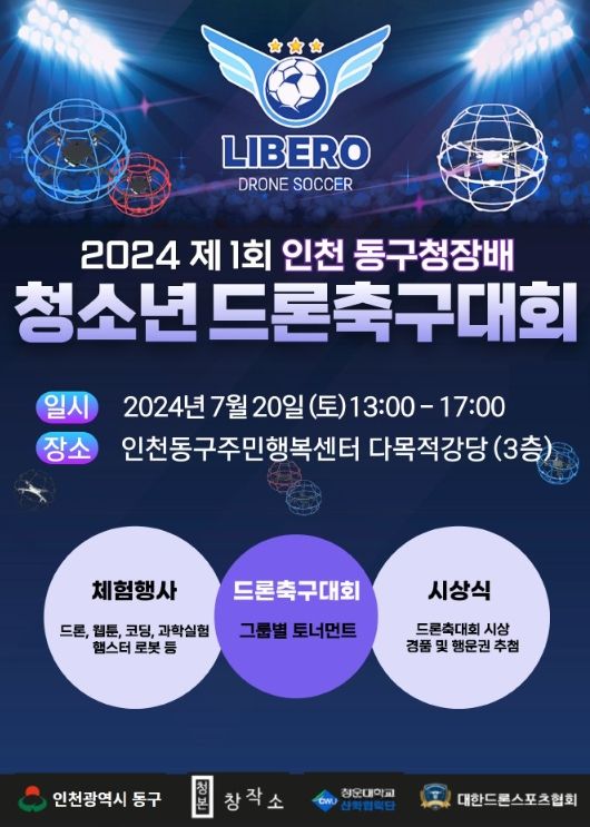 (아름다운교육신문) 인천 동구 청본창작소에서는 오는 20일 주민행복센터 3층 다목적강당에서 ‘제1회 동구청장배 청소년드론 축구대회’를 개최한다고 밝혔다.