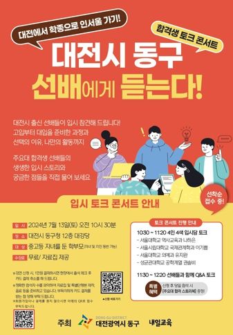 박희조 동구청장은 “이번 강좌를 통해 선배 합격생들의 공부방법, 입시 전략, 입시 스토리 등 생생한 정보를 제공할 계획”이라며 “지역 중·고등학생들의 성공적인 진로 선택과 대학 진학에 도움이 되길 바란다”고 말했다.