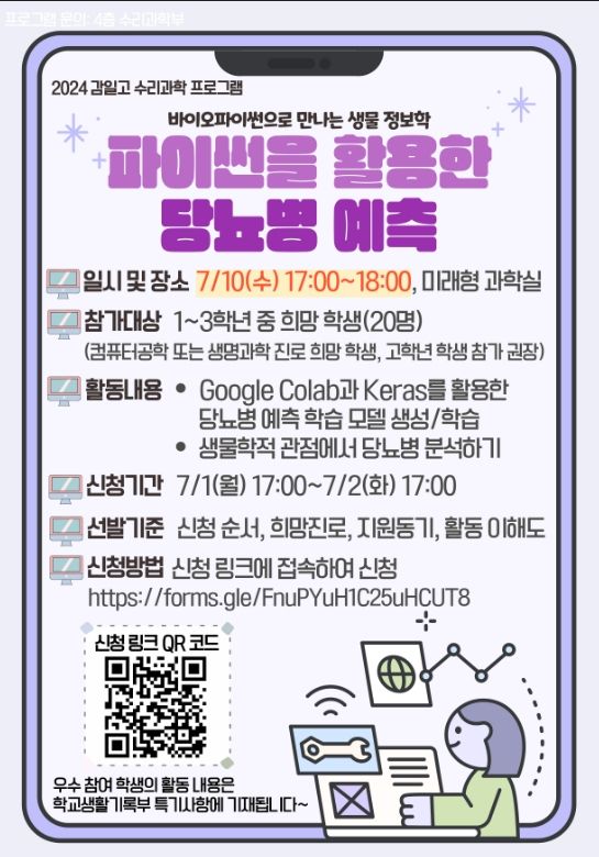 2022년~2023년 인공지능(AI) 선도학교를 운영해 온 감일고등학교는 인공지능 교육의 선도적 경험을 바탕으로 2023년에는 지역맞춤 경기 미래형 과학실을 구축하고 인공지능(AI)의 교과융합적 활용교육에 힘써 오고 있다. 이번 프로젝트는 이러한 융합과학적 교육활동의 일환이다. 컴퓨터 프로그래밍과 생명공학 분야를 융합하여 두 분야로 진로를 희망하는 학생들에게 직접 체험의 기회를 제공하고, 피마 인디언의 데이터 세트를 이용해 당뇨병 여부를 예측하는 머신 러닝 예측 모델을 수립하고 그 정확도를 산출해보며, 생물학적 관점에서 당뇨병의 발병 원인 및 당뇨병 발병에 영향을 주는 변인들을 논리적으로 추론하여 당뇨병 발병률을 낮추는 방안을 창의적으로 모색해 보는데 그 목적을 두고 있다.
