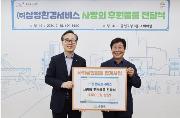 후원품 전달식은 7월 10일 구청 소회의실에서 진행됐으며, 유성훈 금천구청장, 오재광 (주)삼정환경서비스 대표가 참석했다.
