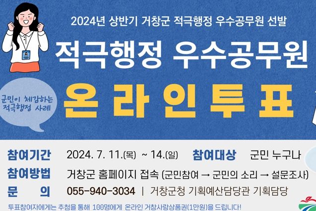 (아름다운교육신문) 거창군은 2024년 상반기 적극행정 우수사례 및 우수공무원을 선발하기 위해 오는 14일까지 거창군 홈페이지에서 군민대상 온라인 투표를 진행한다.