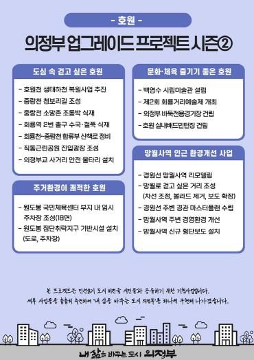 시는 ▲도심 속 걷고 싶은 호원 ▲문화‧체육을 즐기기 좋은 호원 ▲주거환경이 쾌적한 호원 ▲망월사역 인근 환경개선을 목표로 18개의 세부 사업을 추진해 나갈 계획이다.