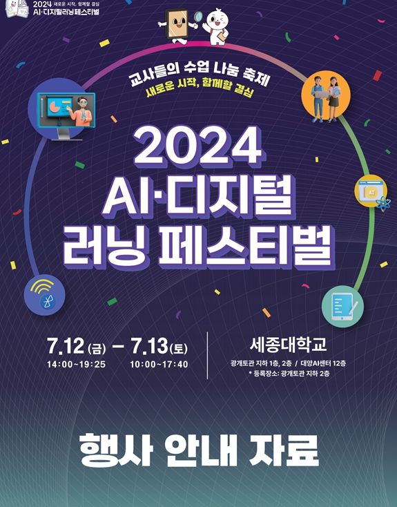 (아름다운교육신문) 서울특별시교육청은 7월 12일 금요일~ 13일 토요일 양일 동안 세종대학교에서 교원, 학생, 학부모, 예비교원(교·사대생) 2,000여 명이 참여하는'2024년 AI·디지털 러닝 페스티벌'을 진행한다.