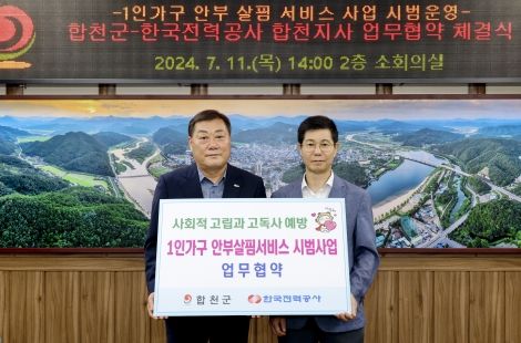 (아름다운교육신문) 합천군은 지난 11일 고독사 예방 및 사회안전망 구축을 위해 한국전력공사 합천지사와 ‘1인 가구 안부 살핌 서비스’ 업무협약을 체결했다.