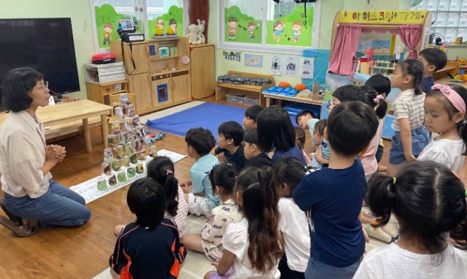 유아 90명은 각 반에서 ‘숲속 친구들이 사라지고 있어요’라는 주제로 동화를 듣고 동화에서 설정한 생태의 문제를 다양한 활동으로 풀어 보았다. 생태계 컵 쌓기, 가방걸이 꾸미기, 피라미드 탑 쌓기, 환경 지키기 비석 놀이를 체험하는 시간을 가졌다.