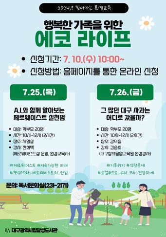 (아름다운교육신문) 대구달성도서관은 오는 7월 25일부터 26일까지 이틀동안 학부모를 대상으로 2024년 찾아가는 환경교육 '행복한 가족을 위한 에코 라이프'를 운영한다.
