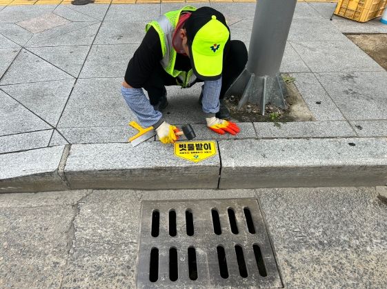 빗물받이는 도로 원활한 빗물 배수 및 침수 피해를 예방하는 시설물로, 구는 주요 도로 중 활엽수 가로수가 근처에 있어 침수 위험이 큰 곳, 쓰레기 등 무단투기가 많은 상가 밀집 지역, 주변 빗물받이 도로 경계석에 스티커를 부착했다.