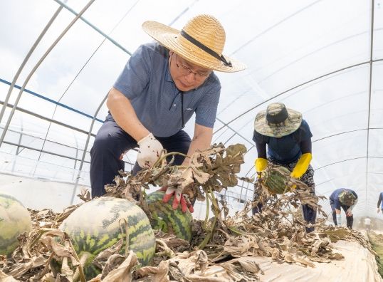 이날 정 시장과 직원들은 용동면의 수박 비닐하우스 농장을 방문해 복구에 힘을 보탰다. 더운 날씨에도 아랑곳하지 않고 침수된 수박 작물을 걷어내고 비닐과 자재 등을 정리하며 일손이 부족해 막막한 주민의 시름을 달랬다.
